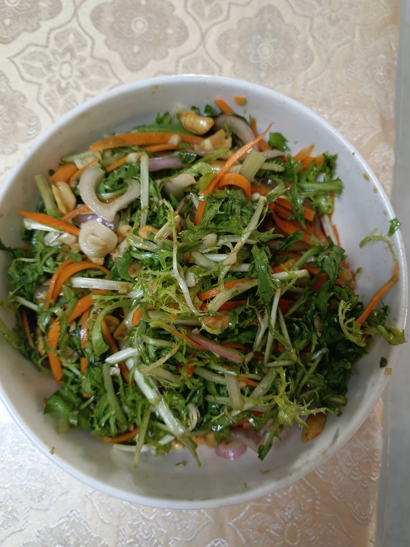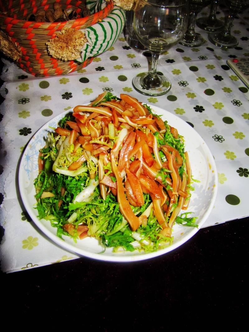 1、苦菊洗净后在淡盐水中泡15分钟左右捞出冲净,杀菌。2、猪耳朵因为是卤味已经有咸味,所以可以不加盐。