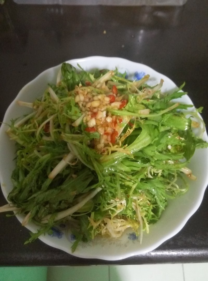 3:泡好的苦菊沥干水份,放生抽,鸡精,麻油拌均匀后放大蒜如图。