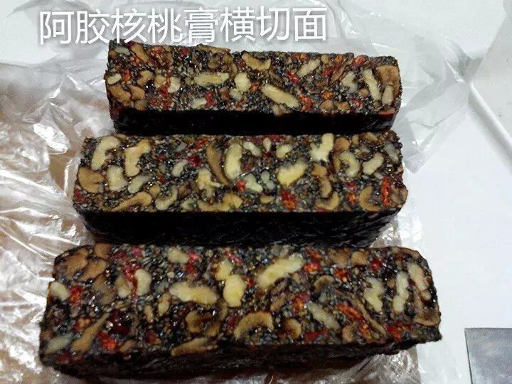 2:阿胶用黄酒泡开,一般从药店打成粉后泡两个小时就行了。核桃仁黑芝麻分别热锅炒一下。熬阿胶要有耐心,开锅后加入冰糖,等出现挂旗的时候,依次加入核桃仁枸杞子黑芝麻。盛器事先刷层油