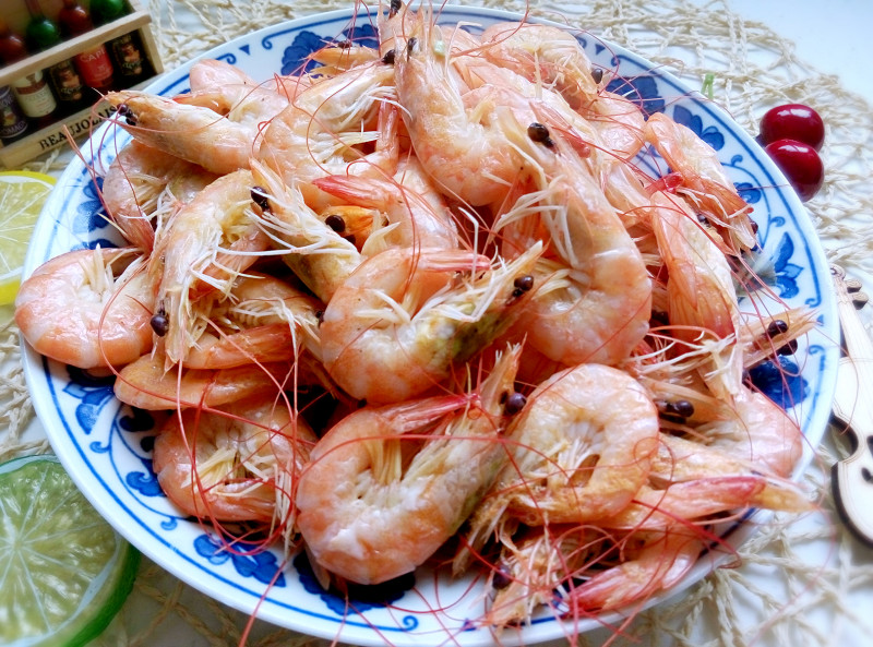 4:煮熟的白虾摆盘,以酱汁蘸食,是温州人最典型的吃法。