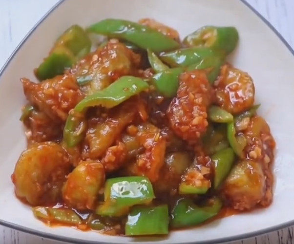8:倒入茄子翻炒均匀,再加入青椒翻炒,然后倒入调好的酱汁,大火炒至收汁即可。