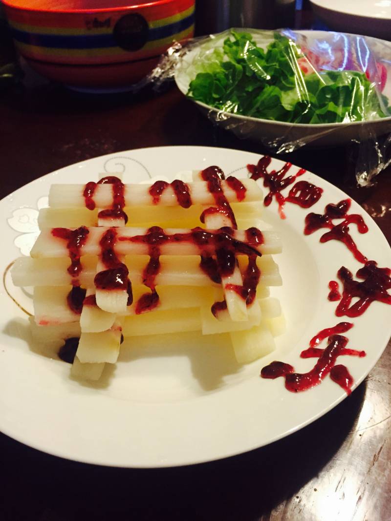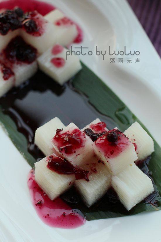 5:蓝莓酱加入等量的凉白开水稀释,滴入山药上,酸甜可口的蓝莓上药来喽……