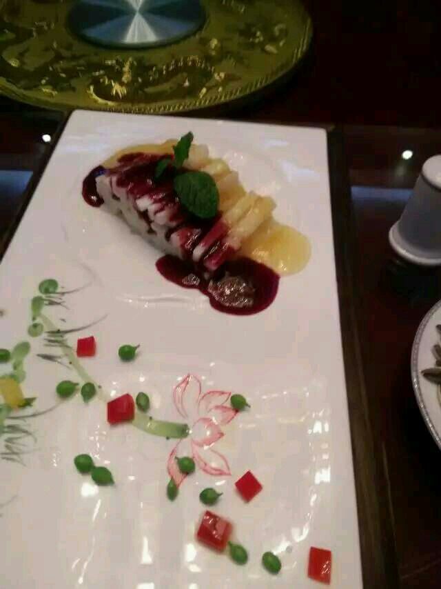 3:3。做好造型入盘,淋上蓝莓酱即可