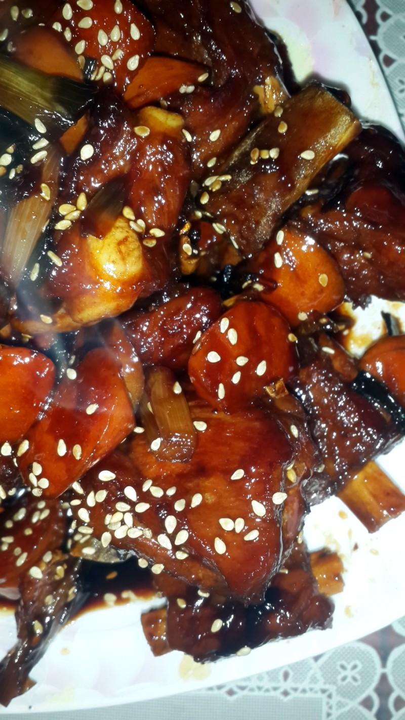 4:倒掉油下少许水,加入少许盐,半匙老陈醋,少许白糖,煮开少许水淀粉勾兑。浓时下排骨翻一下上盘洒点芝麻OK