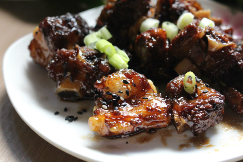 5:将排骨,腌排骨的料,糖,盐,煮排骨的汤放入锅中,大火煮开转小火,煮30分钟左右收汁,加入1汤匙醋出锅,撒上白芝麻和葱花即可。