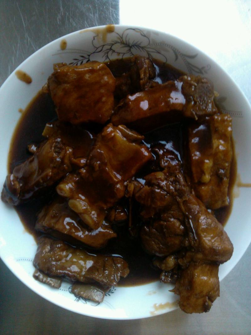 5:炒至起泡后,迅速倒入排骨炒,而后加少量水微火闷几分钟