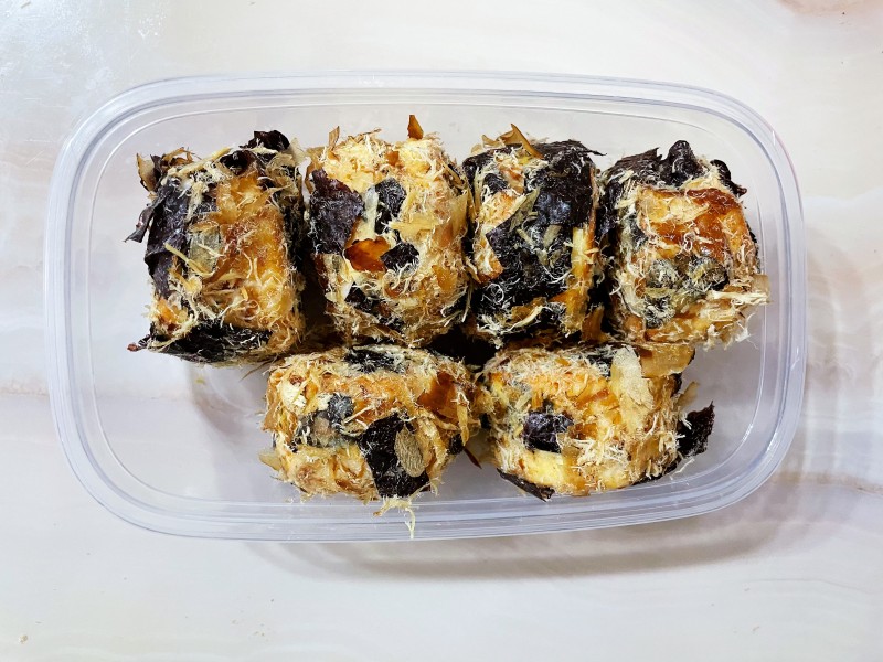 5:拌好的海苔肉松木鱼花。如果没有海苔跟木鱼花可以不用,但是用了以后口感丰富很多。