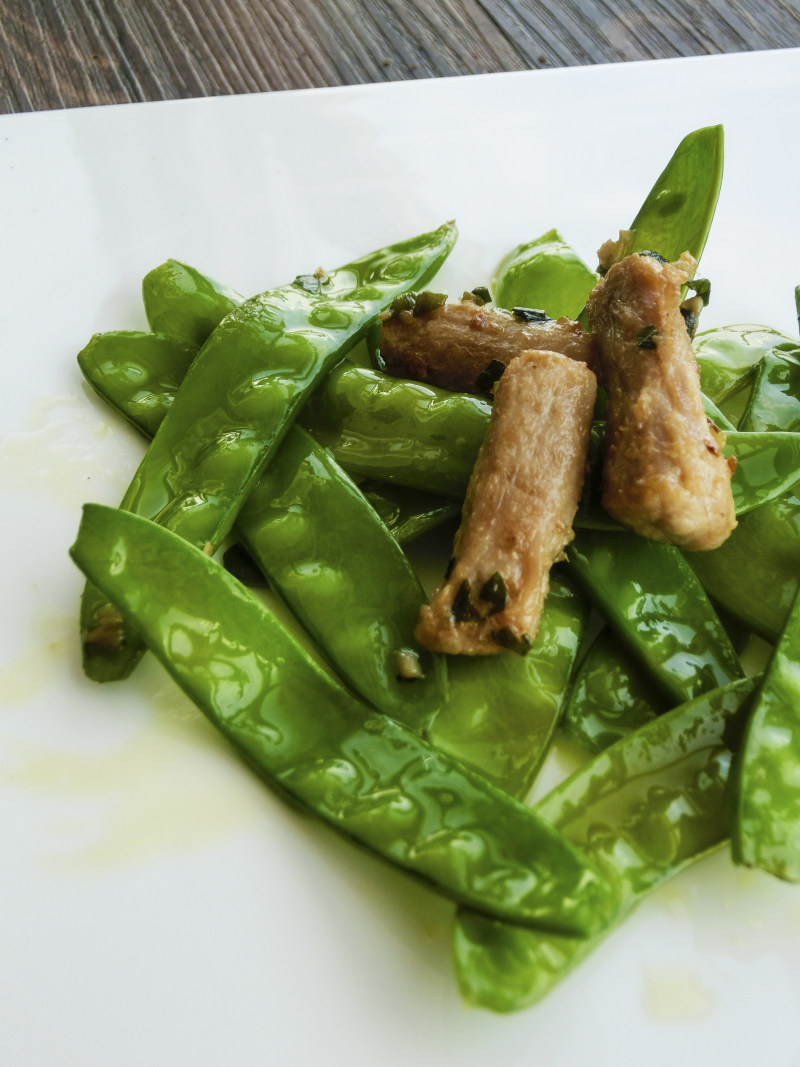 2:松板肉切成小拇指长短的条状,蛋清生粉上浆,用盐味精腌制。荷兰豆去茎摘干净两头,飞水备用。
