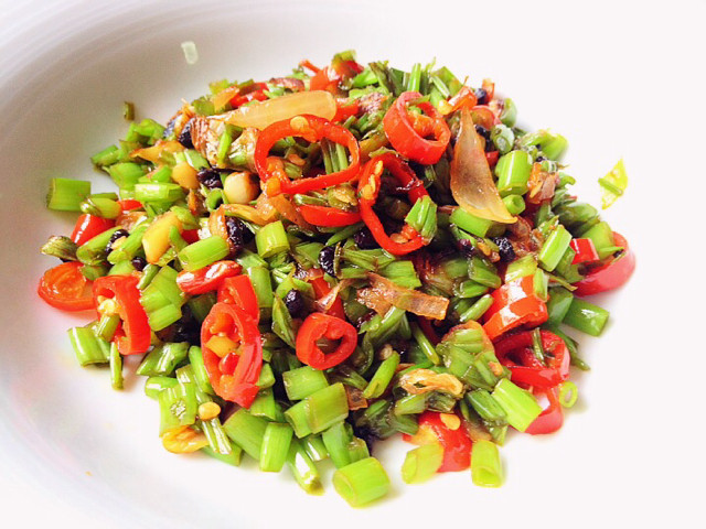 6:豆豉炒香后改大火,放入空心菜和红菜椒快速翻炒断生。