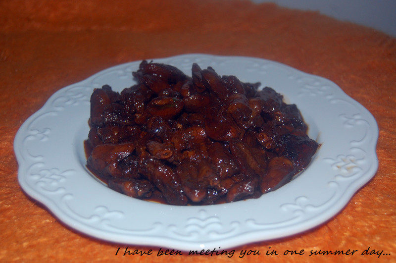 2:用豆豉、料酒、生抽、辣椒面把鸡心拌匀,腌上24小时以便入味。