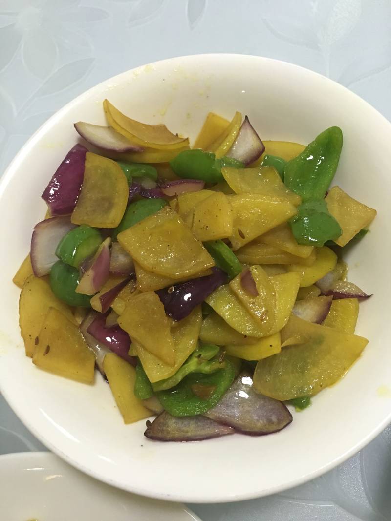 2:炒锅放油,热后放土豆、孜然,五香粉,鸡精,酱油,加点水和盐翻炒断生放青椒翻炒