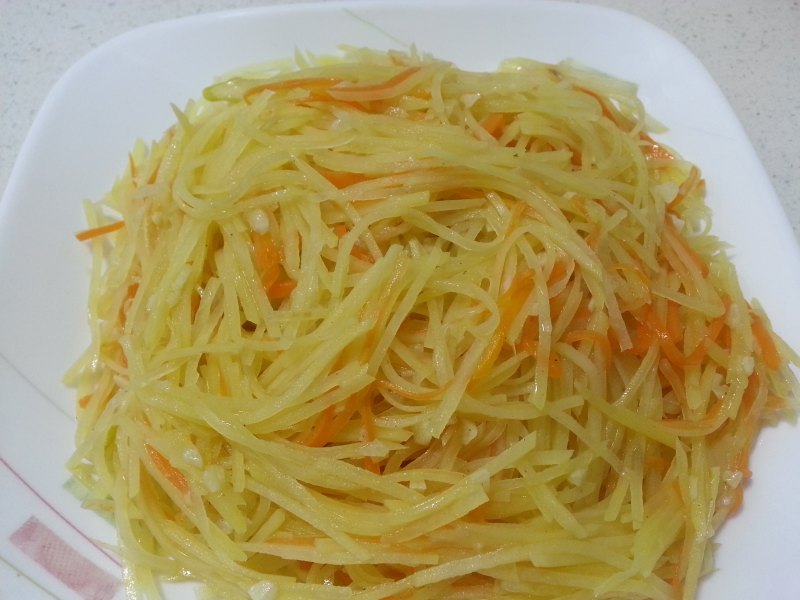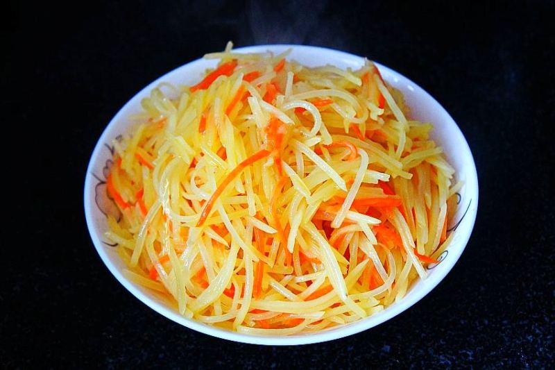 4:锅中倒入植物油,开大火烧热后倒入葱蒜炒出香味,放入土豆丝和胡萝卜丝,翻炒几下,加盐、胡椒粉和牛肉粉煸炒3分钟(根据土豆丝的粗细掌握好煸炒的时间),即可装盘。