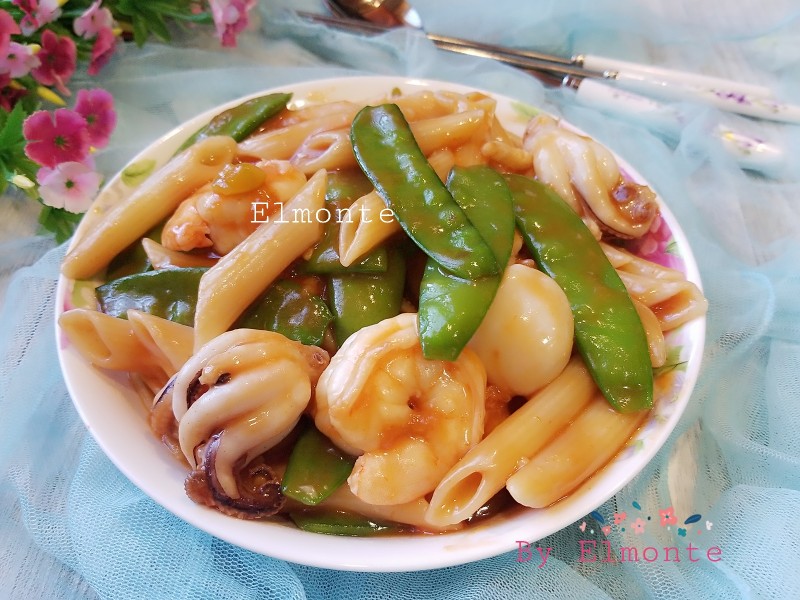 通心意面1包(454g);虾仁10来只;墨鱼仔454g;荷兰豆适量;
