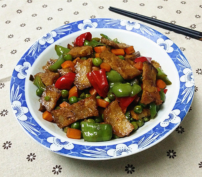 红椒40克;青椒70克;豌豆150克;胡萝卜80克;猪血丸子120克;