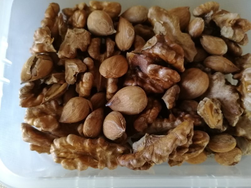1:自家种的核桃和杏儿,吃完杏儿,再砸出杏仁儿。加入大量盐兑水,达到最大饱和度,浸泡2-6小时。时间少了,不入味儿,时间长了,坚果本身营养会稀释吧(感觉)。