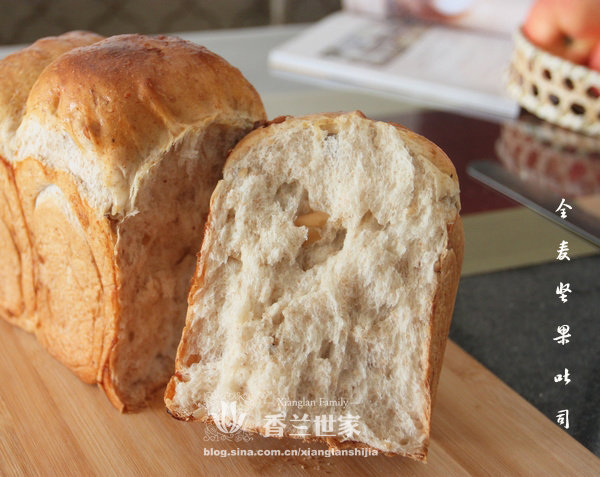 水145克;全麦粉80克;烘焙奶粉11克;鸡蛋22克;坚果50克;