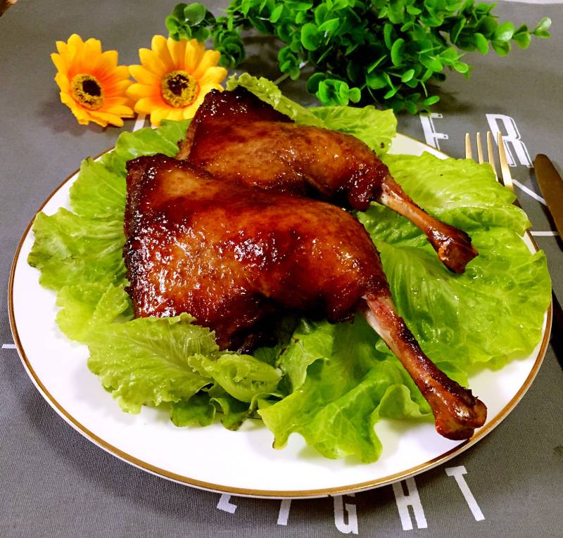 鸭腿2个;老抽半茶匙;叉烧酱2茶匙;蜂蜜2茶匙;盐1小勺;生抽2茶匙;