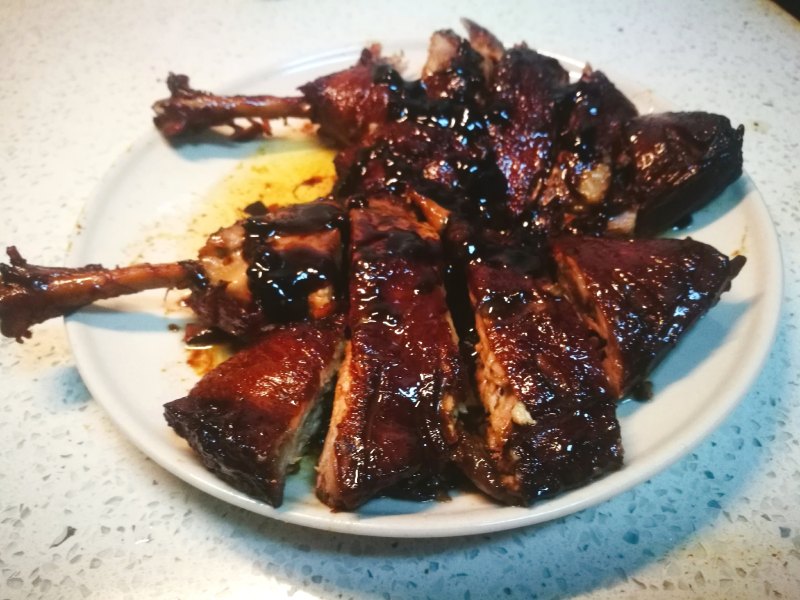 11:收汁提味结束后,汤汁已经基本收尽了,鸭腿外皮也有了一点焦香色。自然放凉后切块码盘开吃!