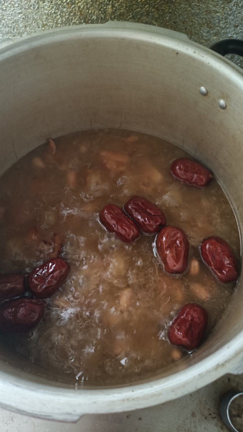 6:转入高压锅,放跑好的花生,再倒入开水,开水,开水上气后转中小火,煮15分钟。