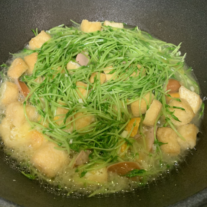 豌豆苗放在最后加入,因为它特别容易熟!快速煮一下就好,不然口感就会变差!