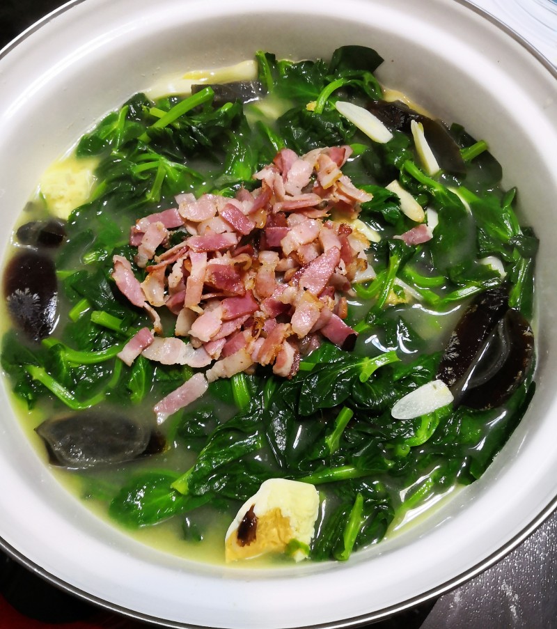 上汤绿豆苗,一道看似素雅却滋味万千的佳肴。它以嫩绿的豆苗为底,衬入金黄皮蛋、醇香火腿与鲜甜蒜粒,再浇上精心熬制的高汤。只需简单烹调,便能将食材的鲜美层层激发,入口清爽柔嫩,汤醇味厚,每一口都是家常餐桌上的鲜香享受。