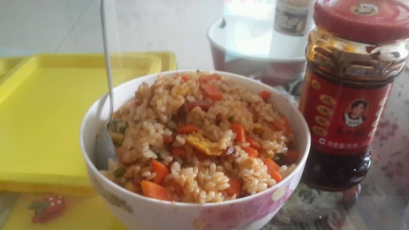 4:加酱油小火反复炒,所有饭粒成酱油色既可。