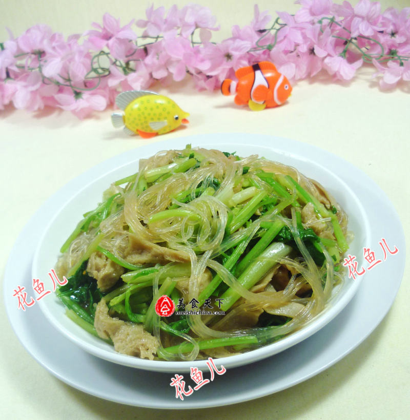 5:接着,合入香芹和已泡软的粉丝翻炒翻炒。