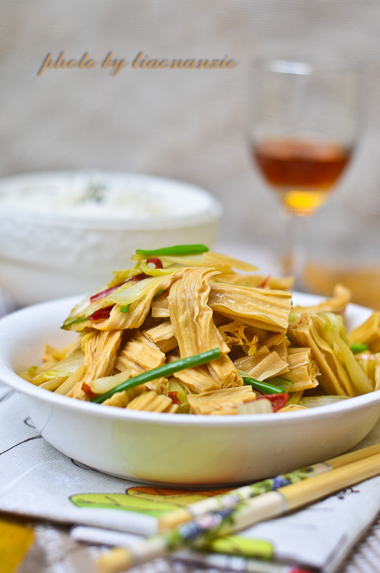 4:接着,合入切好的腐竹翻动一下。