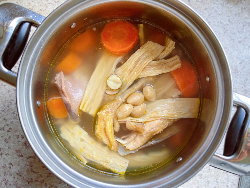 3:把腐竹煮软,腐竹不用提前泡发,加盐调味。喝之前把鸡油滤掉即可。