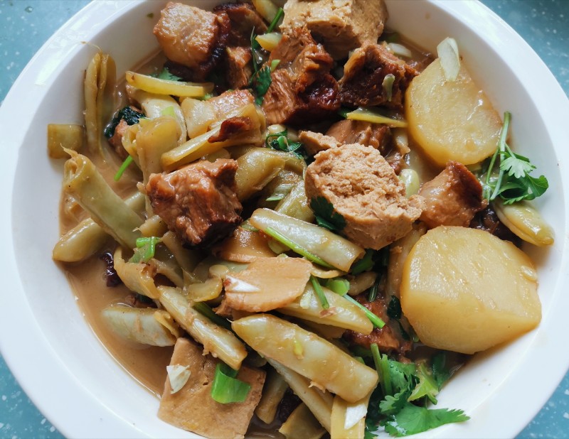 选择猪肉最好是有肥有瘦带皮的那种,炖出来更香。