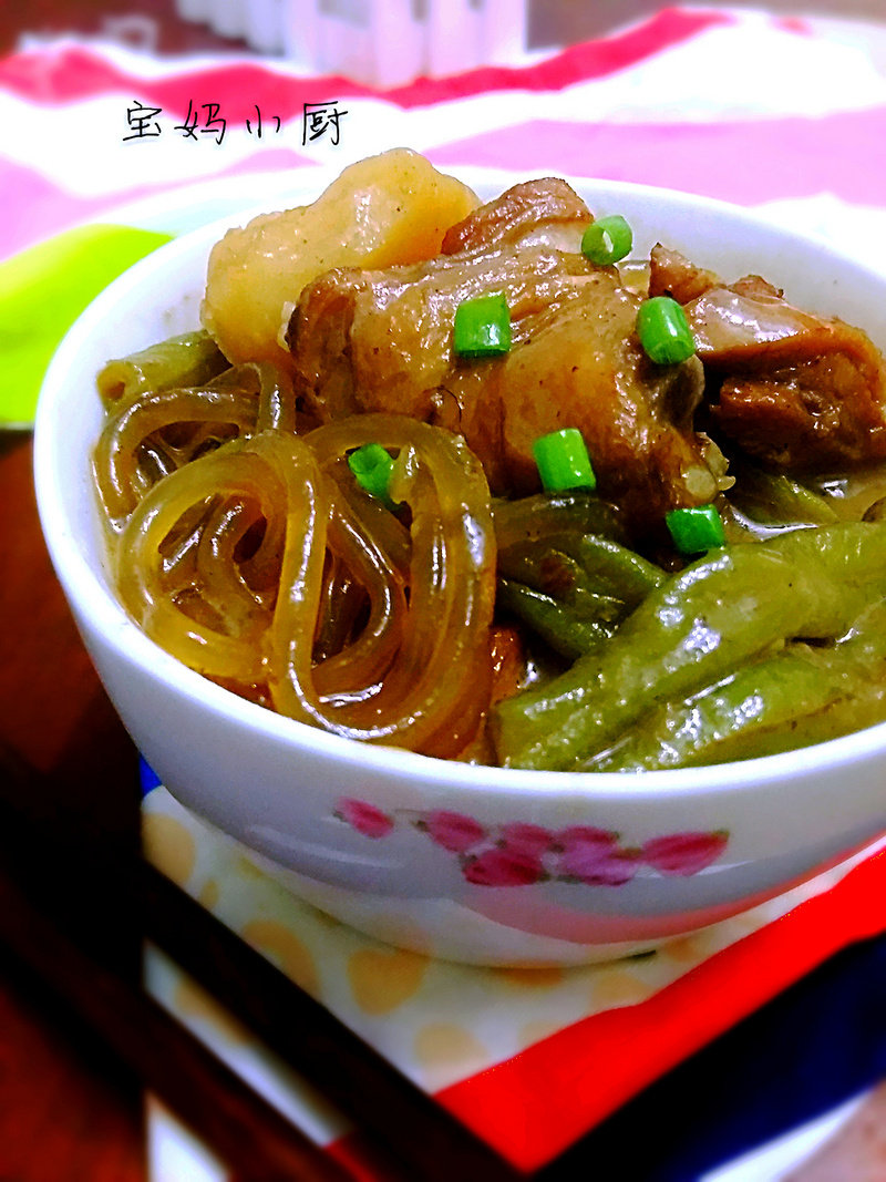 大鸡腿一个;肥肉少许;豆角600克;土豆一个;粉条少许;