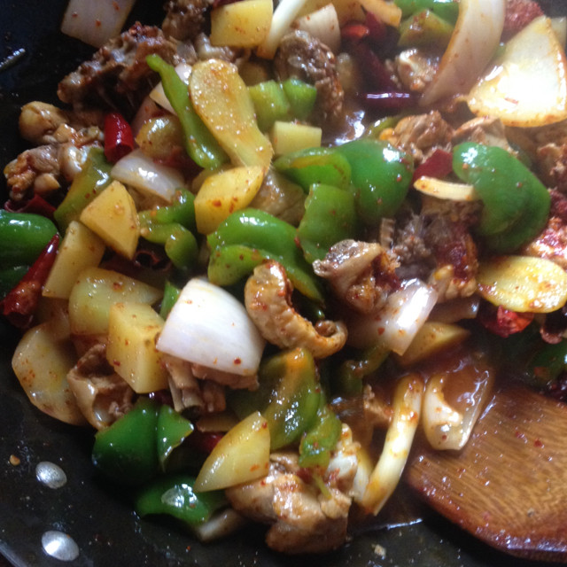 1:先油热后倒入大量辣椒角,炒香倒入鸡块