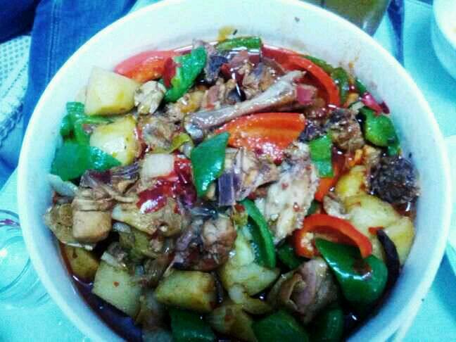 5:炒锅里放入一两多花生油,放入花椒,白糖炒糖色,倒入鸡肉放两勺郫县豆瓣,五个干辣椒,葱姜蒜,大料和炖鸡调料。翻炒一会倒入五百毫升的啤酒和水,再放适量盐炖一刻种。再放入切好的土豆炖一刻种,最后再放彩椒炖二分钟就好了。