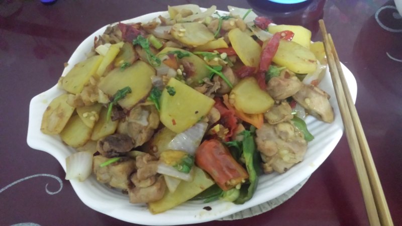 鸡1个;土豆3个;大辣椒2个;洋葱1个;