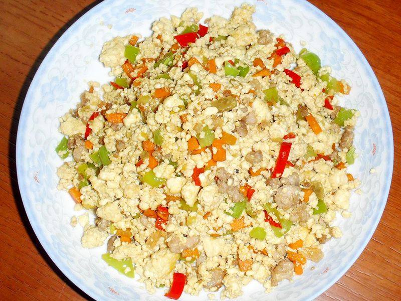 6:锅中做油,肉馅炒散,放入葱姜粒,炒出香味,放入胡萝卜粒,辣椒粒,盐,再放入炒熟的豆腐,炒匀