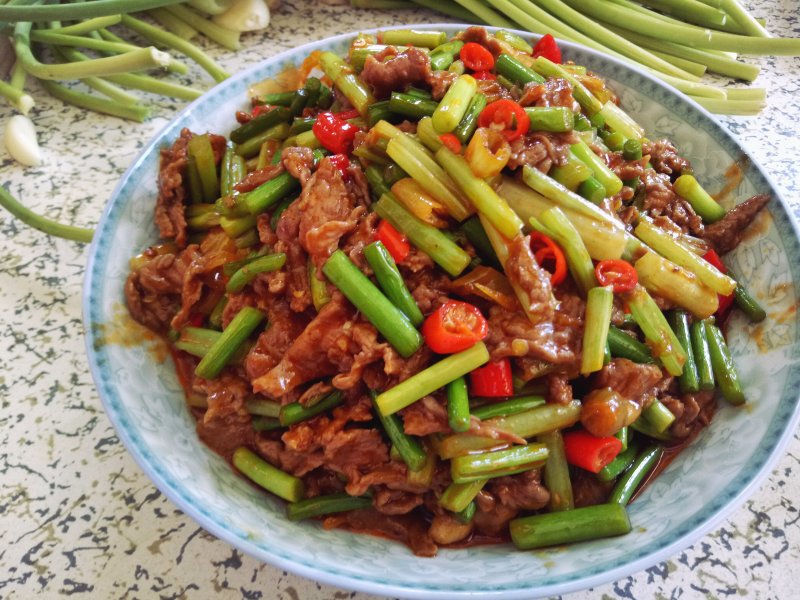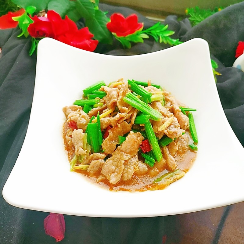 牛里脊肉300g;蒜苗100g;芹菜2根;