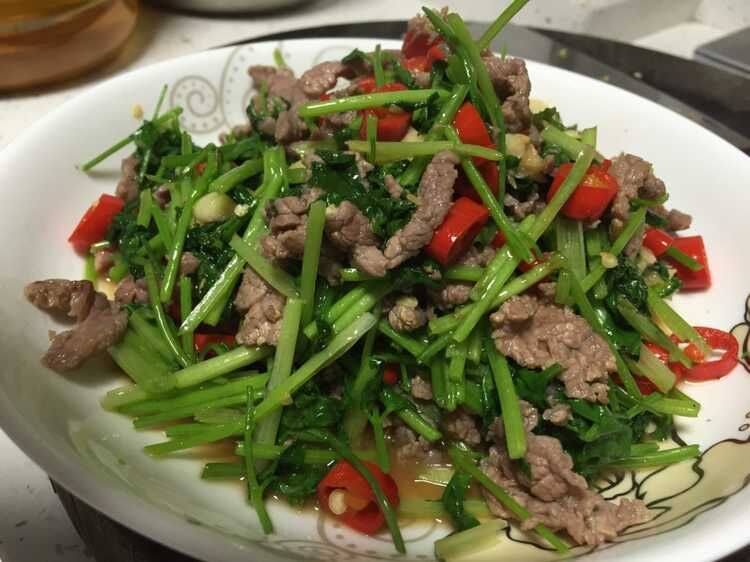 5:1)茶油烧热,下牛肉,大火翻炒,变色即起锅备用;2)下红椒、大蒜,煸炒熟后倒入牛肉和香菜,加盐加鸡精,大火速炒;3)起锅装盘;
