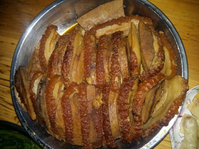 2:五花肉刮洗干净,拔净残毛,下汤锅煮至皮能插筷,捞出趁热抹上饴糖溶液,皮朝下放入油锅,炸至金红色,取出控油,切成厚片。
