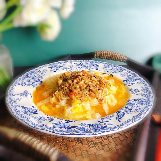 10:把炒好的蟹粉放在烂糊白菜上即可,吃的时候再拌一下。