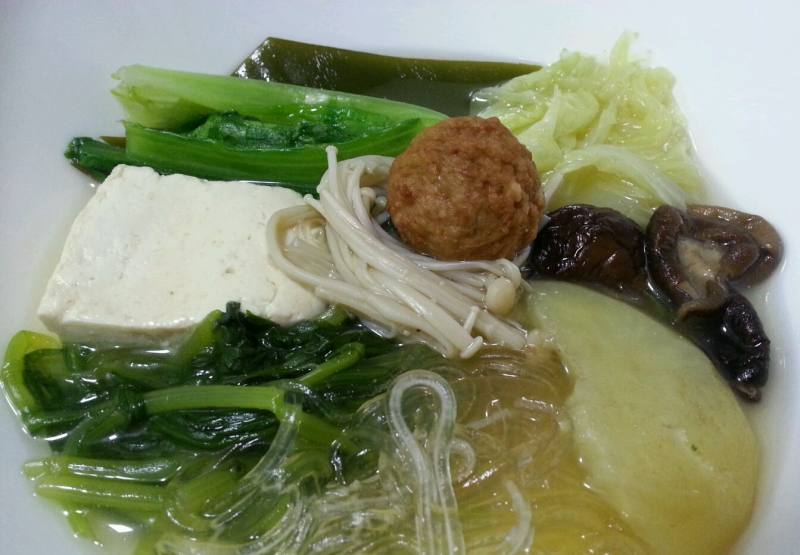 大白菜适量;海带适量;油麦菜适量;豆腐适量;茼蒿适量;土豆适量;香菇适量;金针菇适量;牛肉丸适量;水晶粉适量;昆布1块(15*15cm);萝卜100克;洋葱30克;大葱3段;