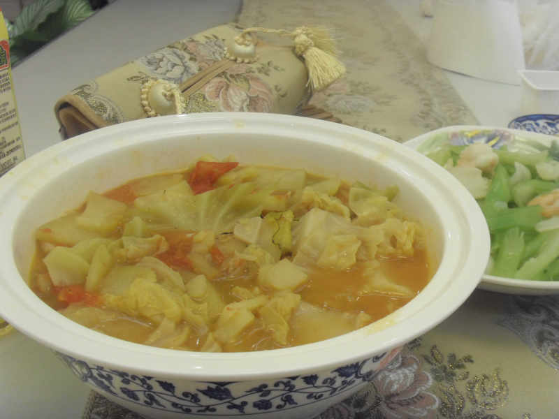 3:炖到土豆圆白菜酥软,西红柿形散的程度就就可以加鸡精出锅了。切记别烧的太干,此菜有汤才好吃。