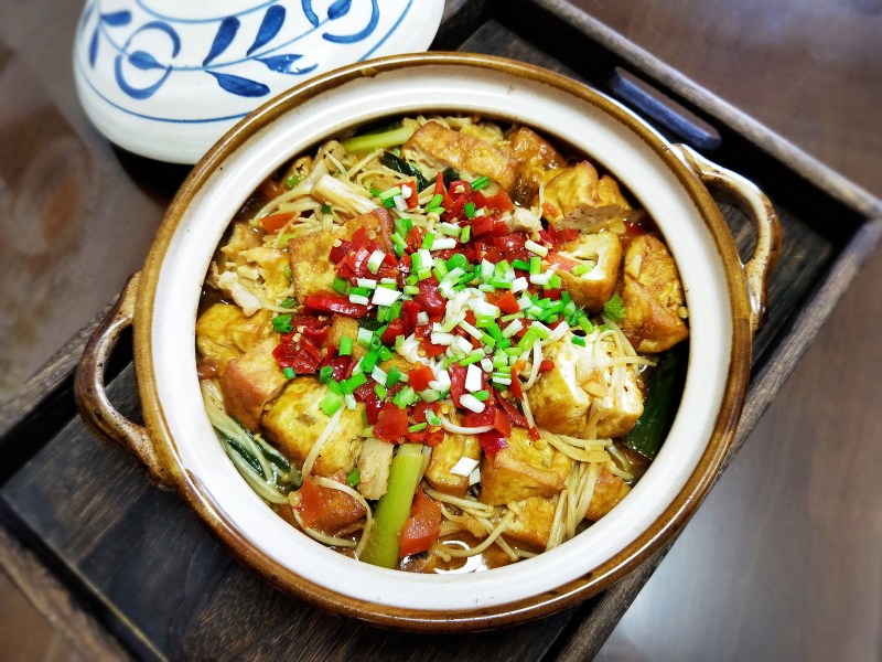 油豆腐300g;金针菇150g;板筋肉120g;西红柿1个;蒜苗3棵;