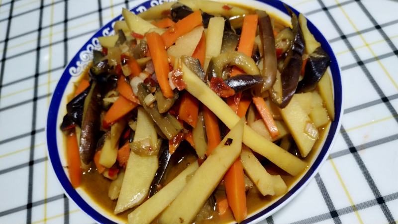 2:锅内倒入适量食用油,加蒜片爆香,加生抽,将三样菜一起倒入炒匀后,加盐加水开锅后,小火炖15——20分钟左右。