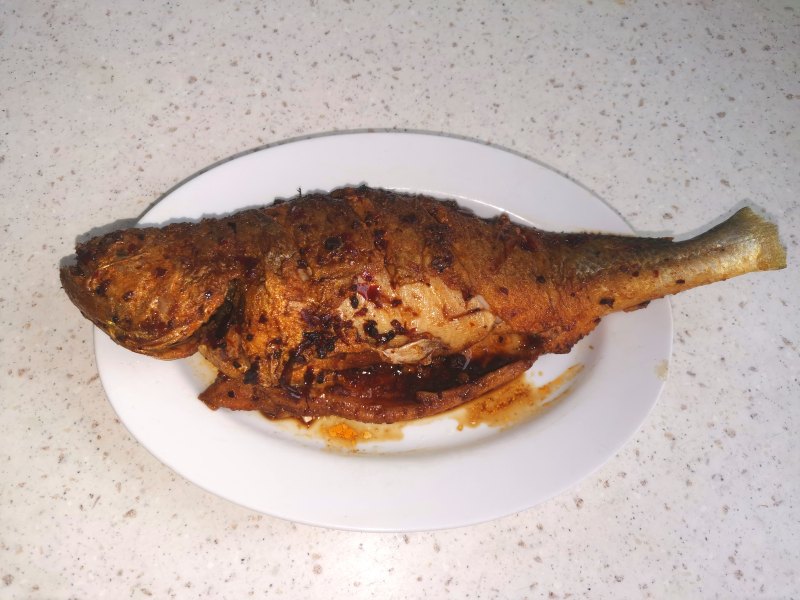 8:烧制过程中,不断将汤汁浇在鱼上使入味。