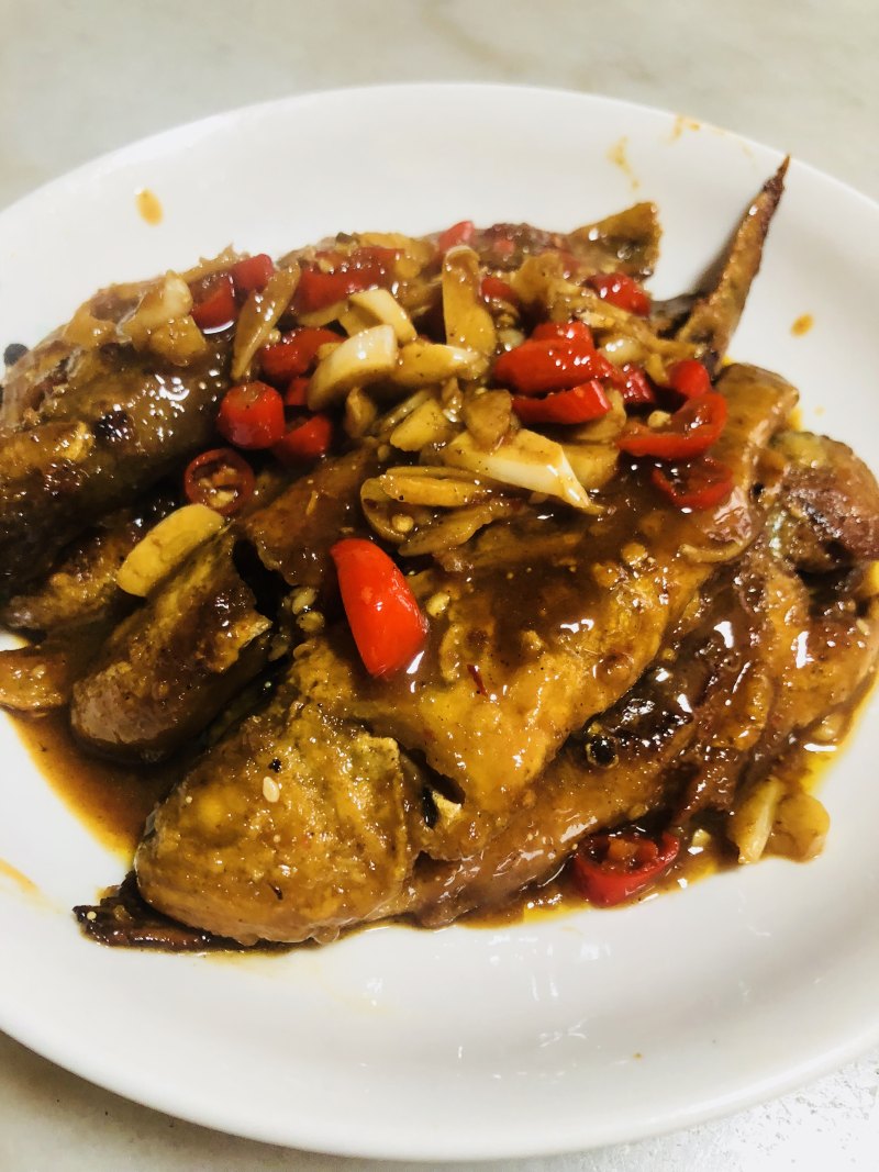 5:放入葱姜蒜八角炒香,倒入适量的水生抽,老抽,白糖烧开,放入黄花鱼,大火烧开,中火烧制20分钟,最后大火收汁。