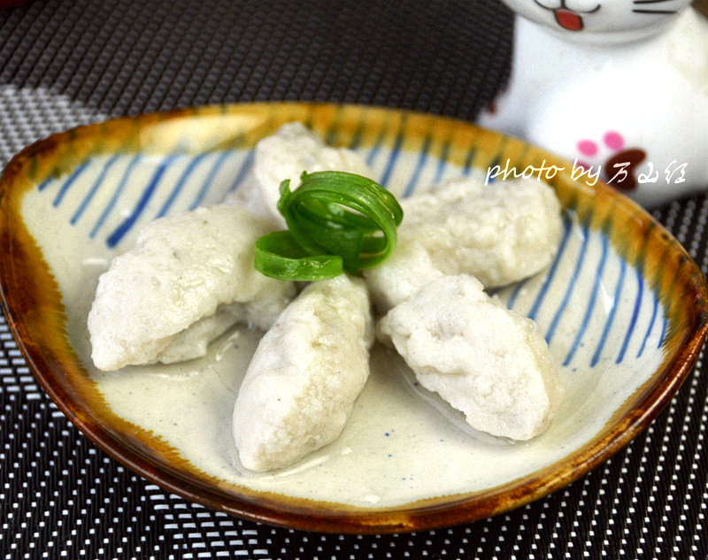 8:取一个干净的勺子,把鱼浆舀入勺子中,锅中放温度约70度的水,盛鱼浆的勺子放入水中,大约2秒左右,鱼浆会凝固自己漂浮起来,然后再放下一勺。勺子每次用之前要在凉水中沾一下,这样就不会粘鱼肉浆。