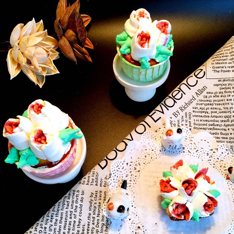 15:把麦芬上面高出部分削平,在上面挤出双色玫瑰花