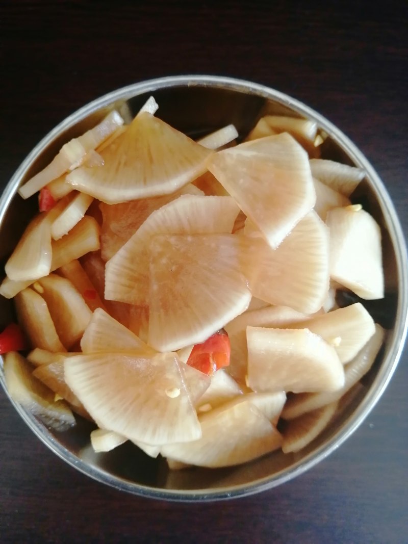 1:白萝卜切片,放盐腌出水,倒掉水。我的是蜂蜜腌过的,所以跳过了这步,也无需再腌。