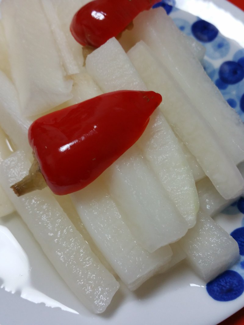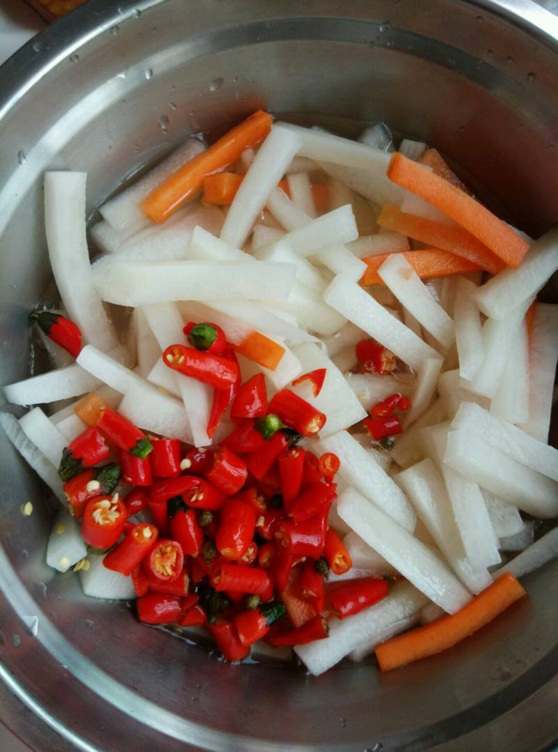 2:倒掉腌出来的水,放白糖、醋、干辣椒。