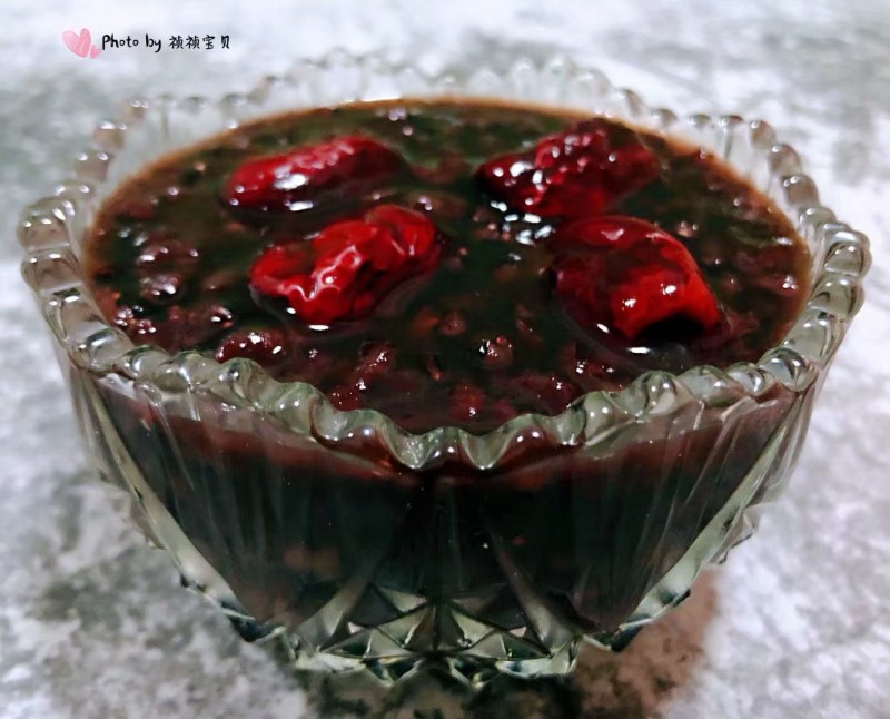 9:熬制大枣完全熟透大米和黑米粘稠即可出锅享用。